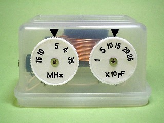 手ごろな大きさで、布団の中に入れて使う短波ゲルマラジオを目指し、ケースはタッパを使います。 タッパは3個で100円(容量180ml)のものです。 ケースの大きさを決めると、使用できる部品の大きさも必然的に上限が定まります。 バリコンは中波用のポリバリコン(2cm角で、公称値260pF)を流用し、同調コイルの直径は3cm程度で自作することにします。 フイルムケースを半分の長さに切断したものに、直径0.8mmのUEWを密着させながら16回巻きました。 また、混信対策として、結合コンデンサーにもポリバリコンを試用することにしました。 結合容量を減らすことで感度の低下、音量の減少によって、聴覚的に混信を軽減させることを期待したものです。 コイルのタップ切り替えは段階的ですが、バリコンの可変では連続的な調整ができます。 結合容量の可変をもって、コイルのタップ切り替えを省略します。